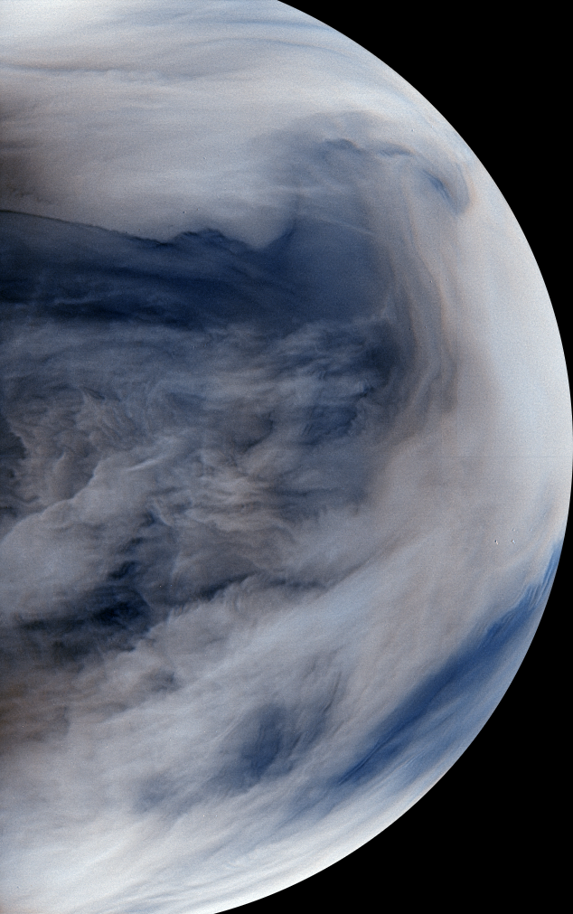 Дневная сторона Венеры синтезированная в искусственных цветах, изображение получено с помощью ультрафиолетовой камеры АМС Акацуки 7 декабря 2015