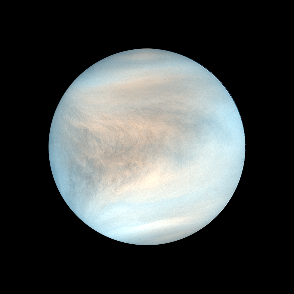 Дневная сторона Венеры синтезированная в искусственных цветах, изображение получено с помощью ультрафиолетовой камеры АМС Акацуки 6 мая 2016 г.