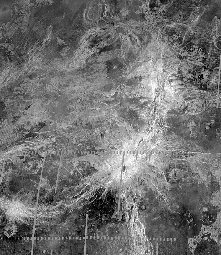 Область Бета, Венера. Область Бета состоит из 2 вулканов — Тея и Рея. Расстояние между этими вулканами около 800 км. Радиолокационный снимок АМС Магеллан.