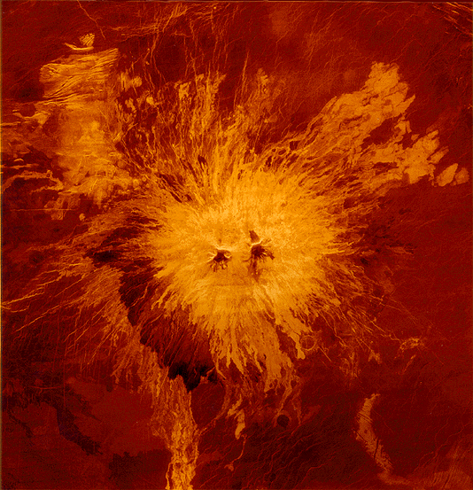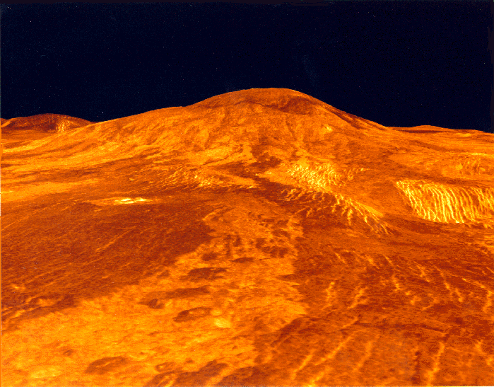 Вид на гору Сиф, Венера. 3D изображение смоделированное компьютером. Смоделировано путем наложения радиолокационных снимков АМС Магеллан на топографию Венеры, цвета добавлены на основе изображений космических аппаратов "Венера-13 и -14". Гора Сиф имеет высоту 2 км и диаметр 300 км.