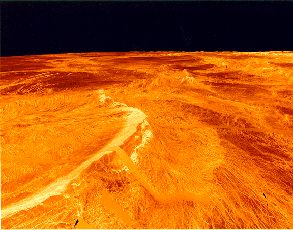 Вид на западную часть региона Эйстла, Венера. 3D изображение смоделированное компьютером. Смоделировано путем наложения радиолокационных снимков АМС Магеллан на топографию Венеры, цвета добавлены на основе изображений космических аппаратов "Венера-13 и -14".