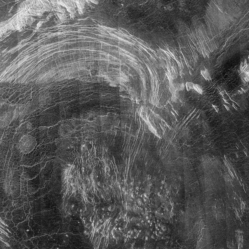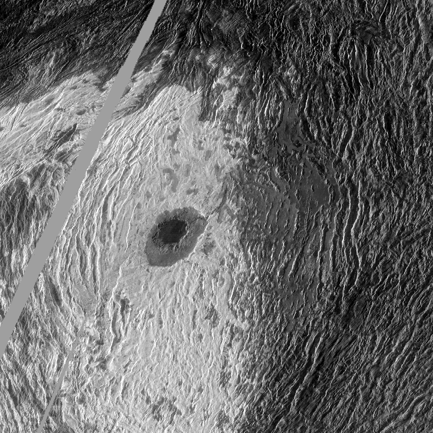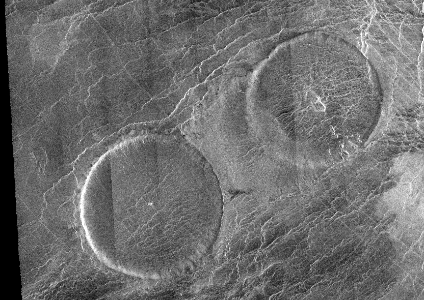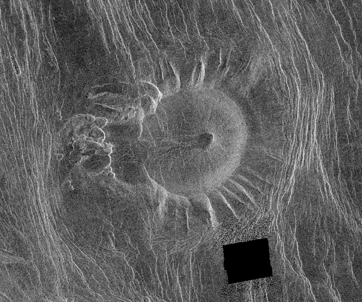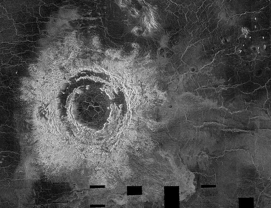 Многокольцевой кратер Мона Лиза (диаметр 86 км) на Венере, радиолокационный снимок АМС Магеллан.