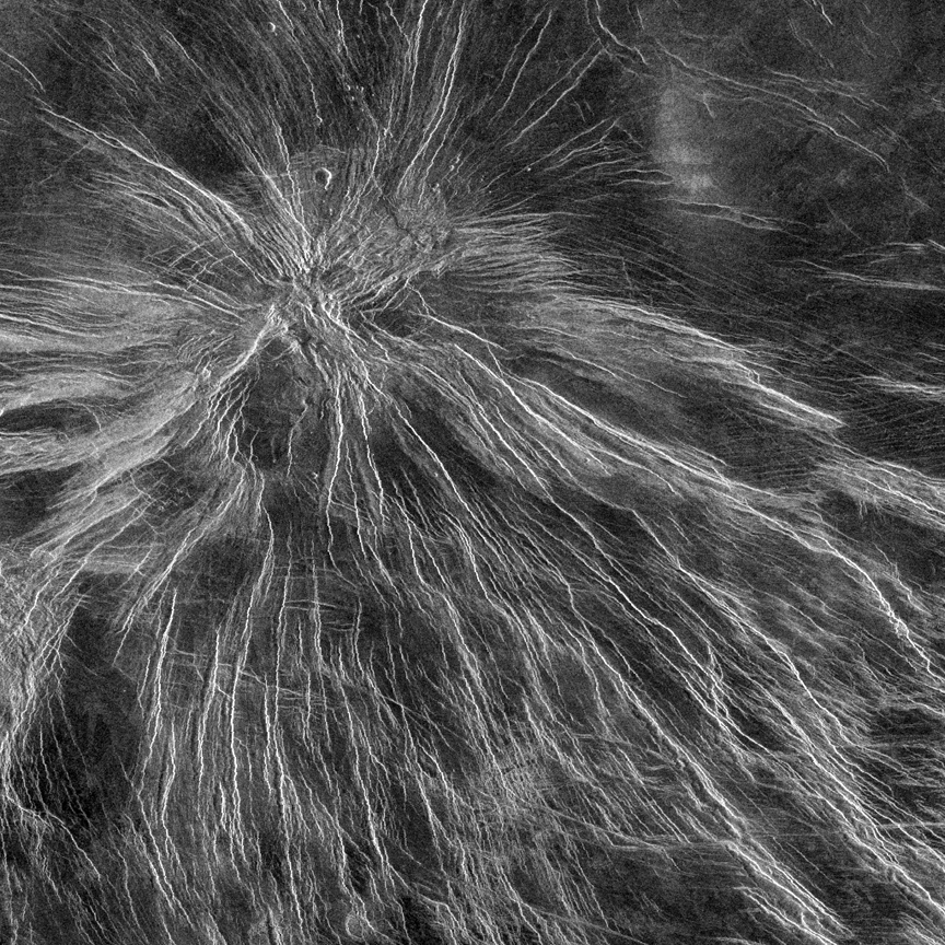Вулкан на северо-востоке региона Альфа, Венера. Диаметр "обода" вулкана около 30 км. Радиолокационный снимок АМС Магеллан.