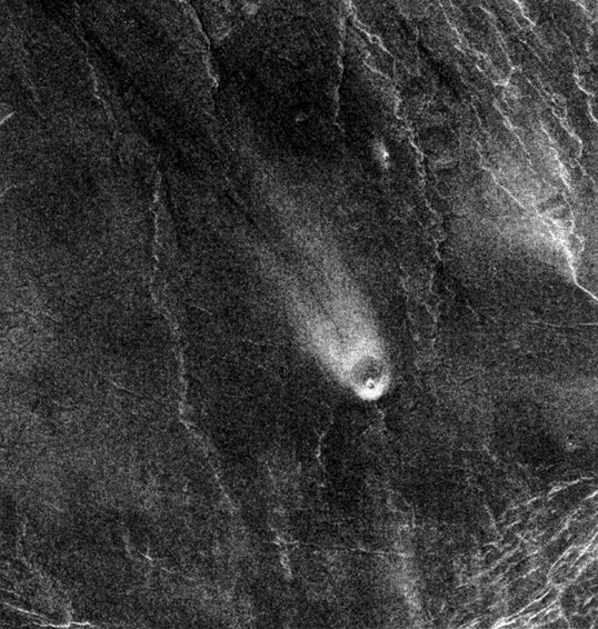 Ветрянные полосы связанные с небольшим вулканом. Диаметр вулкана 5км. Длина ветрянной полосы - 35 км, ширина - 10 км. Радиолокационный снимок АМС Магеллан.