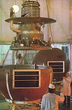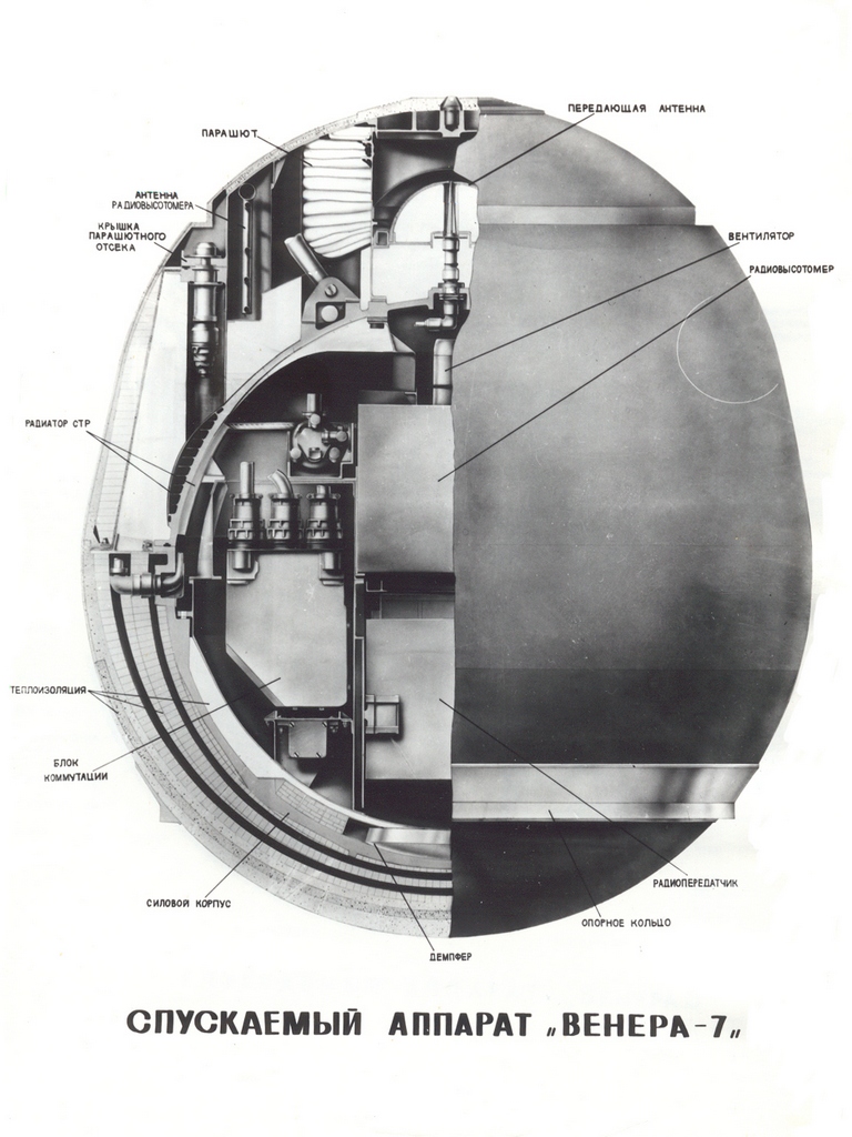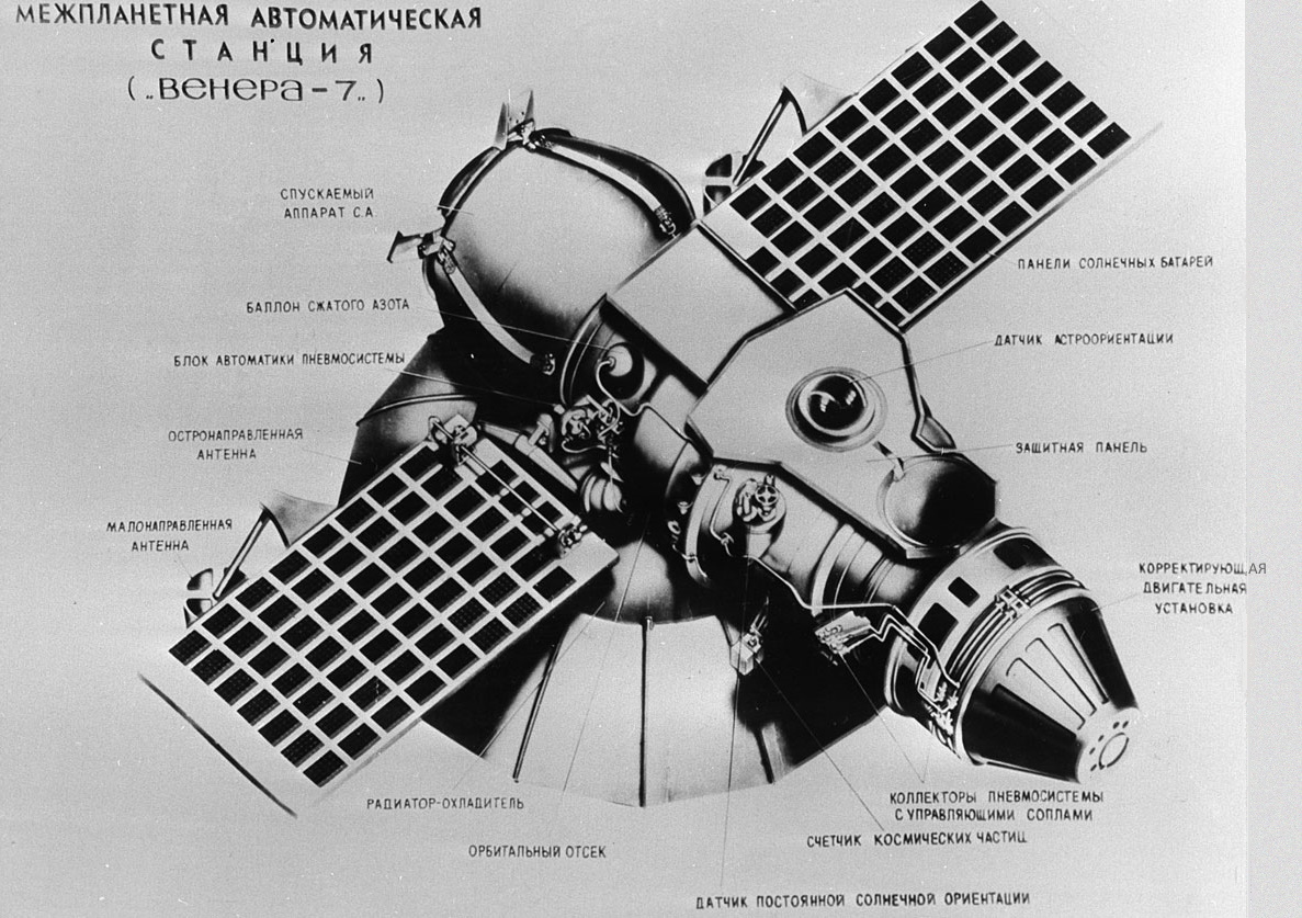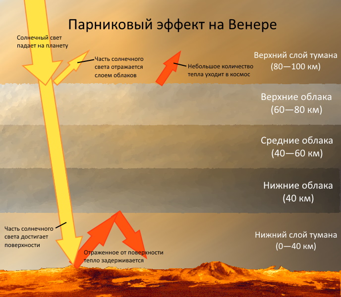Только в декабре 1970 г. советская АМС "Венера-7" смогла опуститься на поверхность планеты. А в 1975 г. "Венера-9" и "Венера-10" смогли передать телевизионные изображения поверхности планеты. В 1982 г. спускаемые аппараты "Венера-13" и "Венера-14" проработали на планете несколько часов и передали ценную научную информацию и изображения. В 1990-1994 гг. около Венеры работал американский космический аппарат "Магеллан", проводивший радиолокационную съёмку поверхности планеты. Атмосфера у Венеры очень плотная, состоит из углекислого газа примерно на 96% и азота на 4%, незначительное количество составляют другие газы (метан, аммиак, окислы азота, серы, соединения хлора и фтора, кислород), водяной пар (0,002%). Планета укрыта трёхъярусным слоем облаков. Облака представляют собой мельчайшие капельки серной кислоты. На планете возможно могут бушевать сильные грозы и сверкать молнии. Длительные наблюдения космического аппарата "Маринера-10" за облачным слоем атмосферы, позволили выявить ряд устойчивых деталей, хорошо заметных в ультрафиолетовых лучах. Они перемещаются в сторону вращения планеты, значительно его опережая, — с периодом в 4-ро суток. Из этого следует, что на уровне верхней границы облаков (65-70 км над поверхностью) дуют ветры с постоянным направлением с востока на запад и скоростью 110м/с. Венера покрыта толстым удушливым слоем углекислого газа и лишь 20% солнечного света доходит до её поверхности. Но не смотря на это температура на поверхности и даже ночью довольно высока из-за плотной атмосферы и так называемого парникового эффекта. Температура на планете может достигать около 500°C.