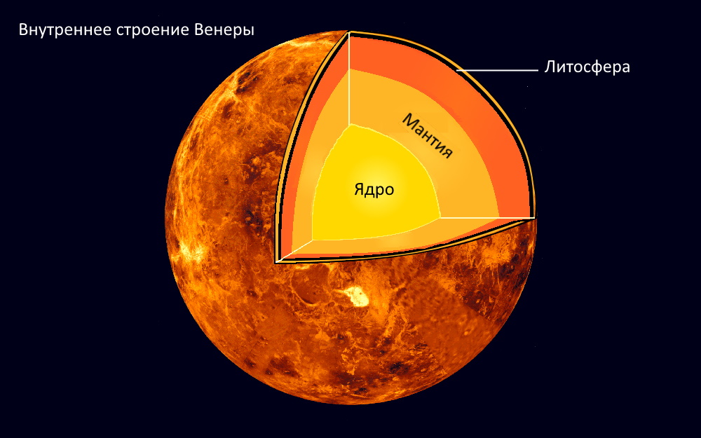0,72 * 150 000 000 ≈ 108 000 000 ≈ 108 млн км У Венеры должно быть жидкое железное ядро, но движение вещества в нем не происходит — нет перемещения заряженных частиц, т.е. электрического тока, а значит и не возникает собственное магнитное поле планеты.